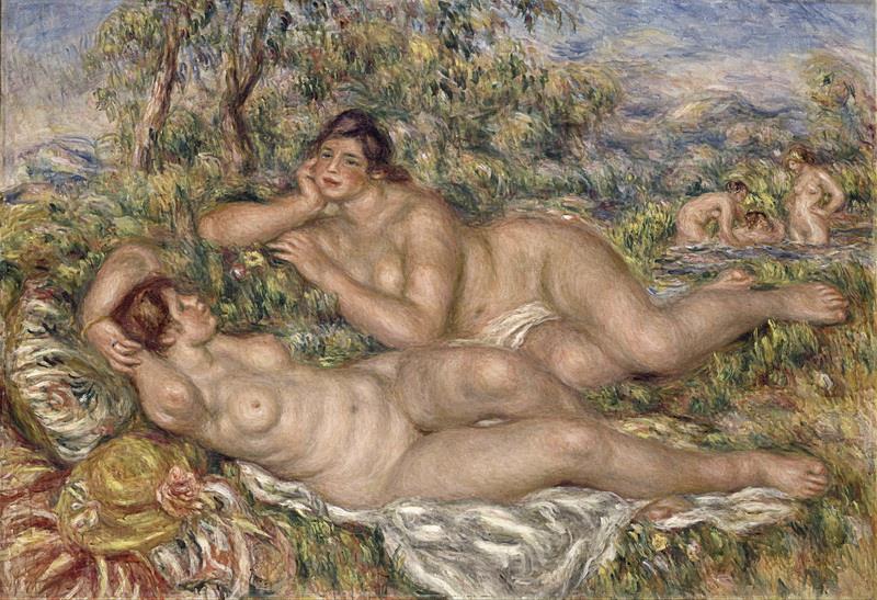 Pierre Auguste Renoir (25 de febrero de 1841 - 3 de diciembre de 1919), es uno de los más célebres pintores franceses. No es fácil clasificarlo: perteneció a la escuela impresionista, pero se separó de ella por su interés por la pintura de cuerpos femeninos en paisajes, inspirados a menudo en pinturas clásicas renacentistas y barrocas. El Impresionismo es un movimiento pictórico que surge en Francia a finales del siglo XIX, en contra de las fórmulas artísticas impuestas por la Academia Francesa de Bellas Artes, institución que fijaba los modelos a seguir y patrocinaba las exposiciones oficiales en el Salón parisino. El objetivo de los impresionistas era conseguir una representación del mundo espontánea y directa, en pinturas creadas "in situ", no elaboradas en el taller tal y como se estilaba hasta entonces. En parte por la necesidad de abreviar la ejecución, se recurre a una pincelada rápida y suelta, y a formatos manejables frente a los formatos monumentales típicos de la pintura académica. Renoir ofrece una interpretación más sensual del impresionismo, más inclinada a lo ornamental y a la belleza. No suele incidir en lo más áspero de la vida moderna, como a veces hicieron Manet o Van Gogh. Mantuvo siempre un pie en la tradición; se puso en relación con los pintores del siglo XVIII que mostraban la sociedad galante del Rococó, como Watteau. En sus creaciones muestra la alegría de vivir, incluso cuando los protagonistas son trabajadores. Siempre son personajes que se divierten, en una naturaleza agradable. Se le puede emparentar por ello con Henri Matisse, a pesar de sus estilos distintos. Trató temas de flores, escenas dulces de niños y mujeres y sobre todo el desnudo femenino, que recuerda a Rubens por las formas gruesas. En cuanto a su estilo y técnica se nota en él un fuerte influjo de Corot. Renoir posee una vibrante y luminosa paleta que hace de él un impresionista muy especial. "El palco", "El columpio", "El Moulin de la Galette", "Le dèjeuner des canotiers", "Bañistas", son sus obras más representativas.