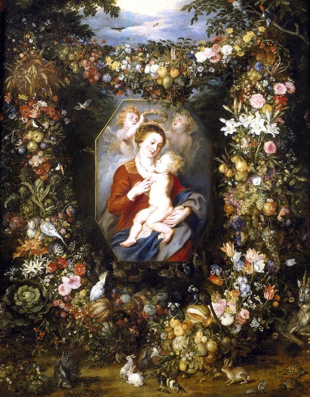 La Virgen y el Niño en un cuadro rodeado de flores y frutas