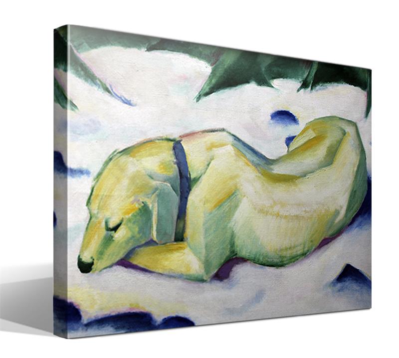Perro que miente en la nieve es una obra del artista alemán Franz Marc creada en 1910. Esta pintura al óleo representa a un perro tendido en la nieve mirando al cielo. La obra se caracteriza por sus colores brillantes y saturados, que son una marca distintiva del estilo del artista.Franz Marc fue uno de los fundadores del movimiento expresionista alemán y sus obras se caracterizan por la utilización de formas y líneas curvas y la búsqueda de la expresión emocional. En Perro que miente en la nieve, Marc transmite la placidez y tranquilidad que siente el perro mientras disfruta del paisaje natural.La obra ha sido interpretada como una muestra del amor de Marc por los animales y la naturaleza, algo que se puede apreciar en muchas de sus obras. Esta pintura es un claro ejemplo del estilo de Marc, ya que logra transmitir la sensación de serenidad y paz que se desprende del animal descansando en medio del paisaje nevado.Si eres amante del arte y deseas tener esta obra en tu hogar, te ofrecemos la oportunidad de obtener una de nuestras reproducciones en alta calidad en nuestra tienda de cuadros famosos. ¡Hazte con un Perro que miente en la nieve de Franz Marc y disfruta de su tranquilidad y armonía cada día en tu hogar!