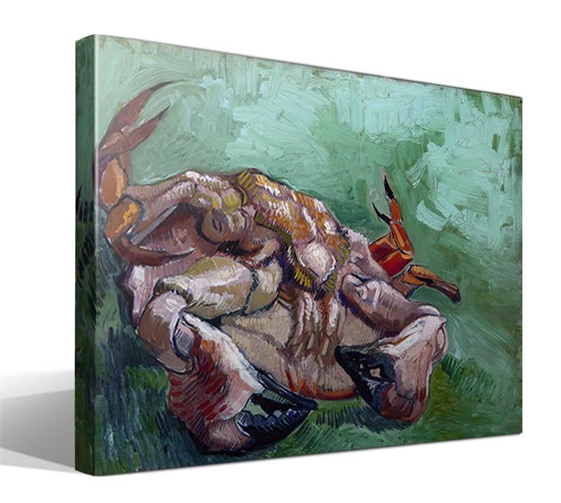 Pintura al óleo del artista Vincent van Gogh en la que representa una naturaleza muerta, dando lugar a un cangrejo boca arriba con un fondo verde profundo. Ideal para reproducir como cuadro o fotomural para tus paredes.